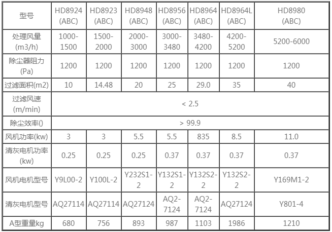 HD袋式除塵機(jī)組有六種規(guī)格: