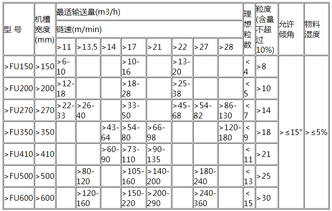 鏈式輸送機的規(guī)格性能列入表一。表中列出了各機型在不同鏈速下的輸送能力范圍。同樣的輸送量可以在表中選到不同的機型,若選用較大機型則鏈速較低、磨損小,但設(shè)備投資較高,若選用較小機型則鏈速較快,磨損相對較高,但設(shè)備投資較省。應(yīng)當指出,當實際輸送量達不到該機輸送能力的65%時,由于機槽內(nèi)物料層過薄而造成輸送鏈空轉(zhuǎn),也會增加設(shè)備的磨損。因此,建議輸送機的實際輸送量不宜低于表一中輸送能力的較小值,以實際輸送量乘以1.2以后,也不宜高于表中輸送能力的較大值。
